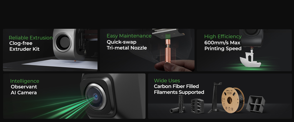 Dotata di una punta dell’ugello in acciaio temprato, di una camera chiusa e di un hotend a 300°C, la K1C 2025 gestisce facilmente filamenti abrasivi in fibra di carbonio come PA-CF e PET-CF, nonché materiali ad alta temperatura come ASA e PC.